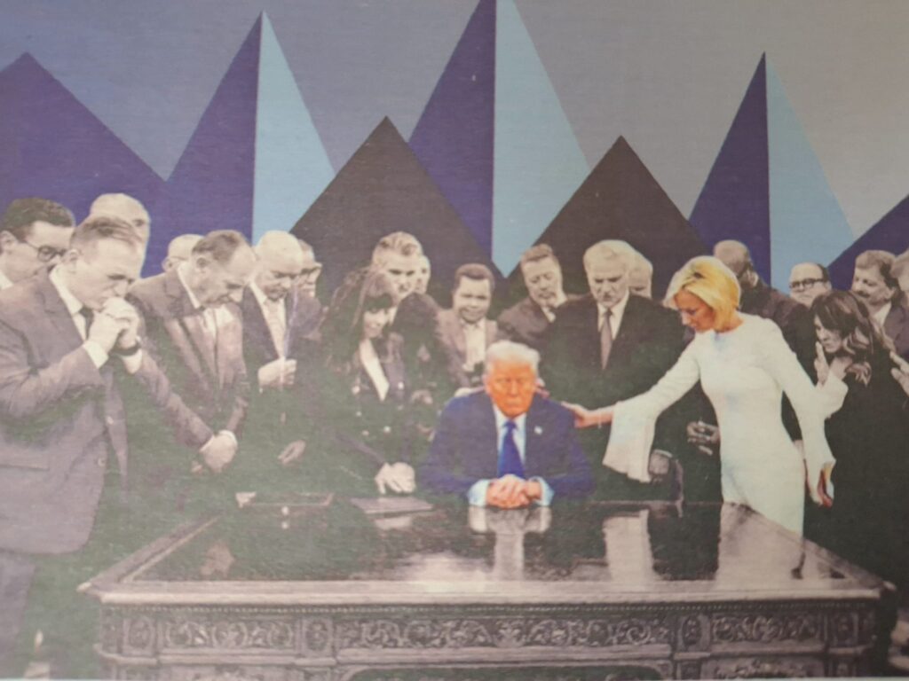 Ristin Voitto -lehdessä oli oheinen kuva, jonka kuvateksti kuului: ”Trump on perustanut Valkoiseen taloon Uskon toimiston (Faith Office), jonka johdossa on NAR-liikkeen oppeja kannattava pastori Paula White-Cain (kuvassa Trumpia siunaava valkoisiin pukeutunut nainen).”