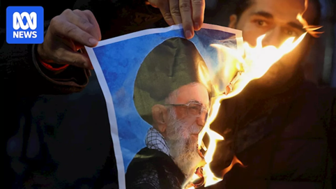 Kuvassa iranilainen pappisvallan vastustaja on sytyttänyt Khamenein kuvan tuleen.