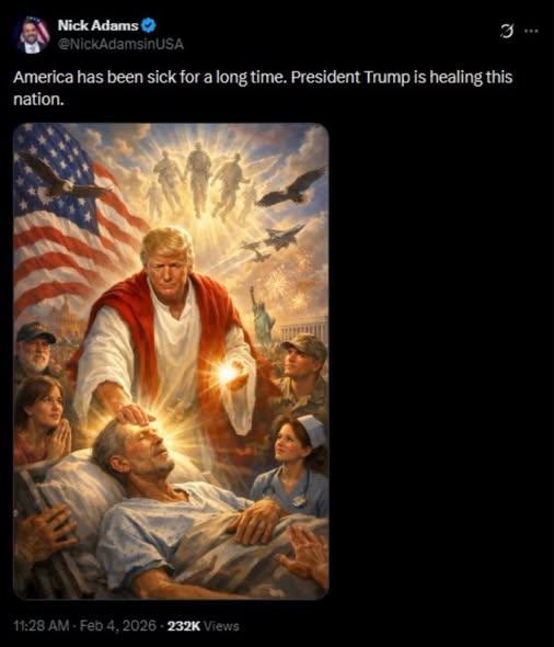 Presidentti Trump julkaisi Truth Social- somealustallaan joitakin päiviä sitten oheisen tekoälyllä tehdyn kuvan, jossa hänet kuvataan Amerikan poliittisena parantajana, koska Yhdysvallat on ollut jo pitkään yhteiskunnallisesti sairas.