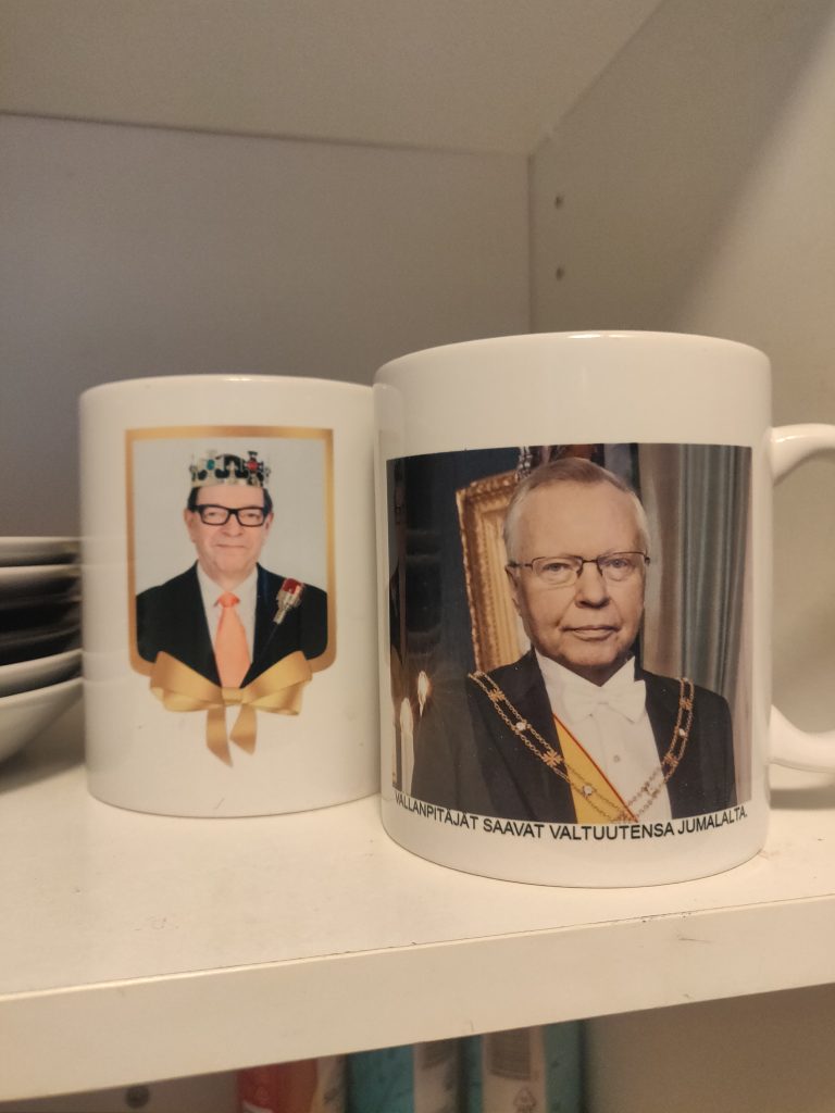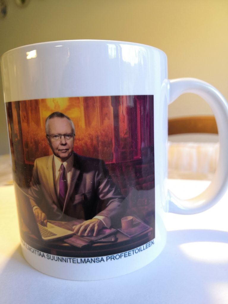 Sain tänään presidenttimukin. Tuli nopeasti kahdessa päivässä. Kuva ohessa. Kuvan alla on teksti ”Vallanpitäjät saavat valtuutensa Jumalalta”. Ilmoita minulle (jouko.piho@kolumbus.fi), jos haluat tilata mukin, niin ilmoitan sinulle tilinumeroni. Kun mukin hinta 30 e on maksettu, firma postittaa mukin sinulle. Voit tilata halutessasi useampiakin kappaleita.