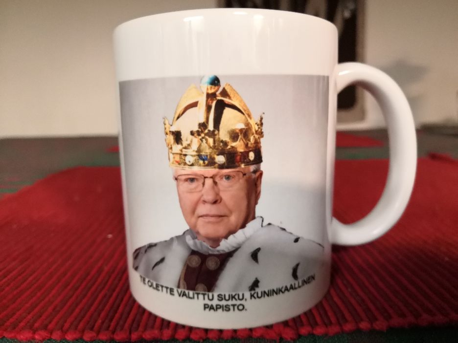 Sain tänään tilaamani kuningasmukin, jossa kuvani alla on teksti: ”Te olette valittu suku, kuninkaallinen papisto.” Siis kaikki uskovat ovat Kristuksen pappeja ja kuninkaita.