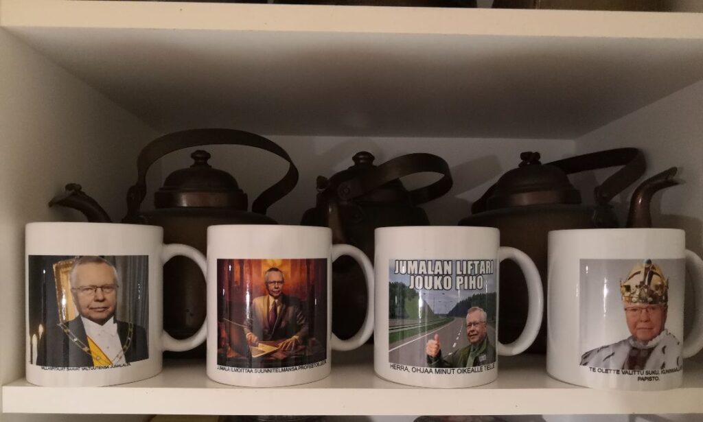 Koska kaikki eivät ole välttämättä tietoisia, että olen teettänyt kolme minuun liittyvää mukia, niin kerron tässä uudestaan, että minulta voi tilata 30 euron hintaan presidenttimukin, jossa on teksti ”Vallanpitäjät saavat valtuutensa Jumalalta”, profeettamukin, jossa on teksti ”Jumala ilmoittaa suunnitelmansa profeetoilleen” ja liftarimukin, jossa ovat tekstit ”Jumalan liftari Jouko Piho” ja ”Herra, ohjaa minut oikealle tielle.”