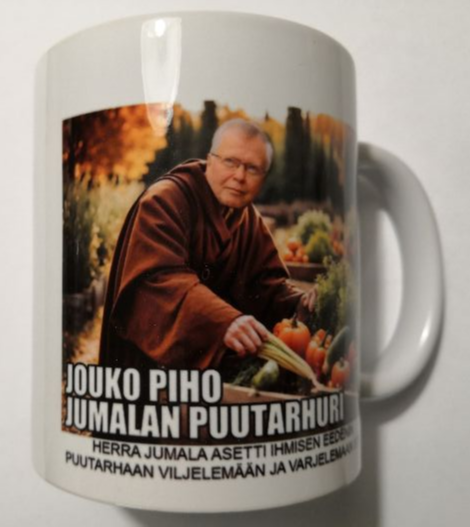 Sain tänään postitse Ifolorilta Jouko Piho Jumalan puutarhuri -mukin. Alla on teksti: ”Herra Jumala asetti ihmisen Eedenin puutarhaan viljelemään ja varjelemaan sitä.”