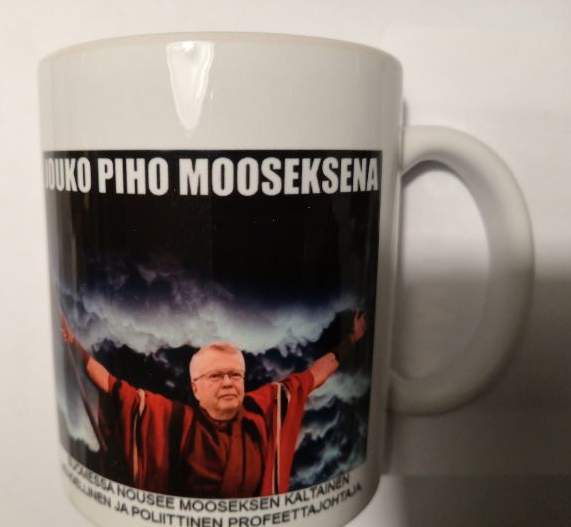 Nyt voi tilata uusinta mukiani ”JOUKO PIHO MOOSEKSENA”. Kuvan alle tulee teksti: ”SUOMESSA NOUSEE MOOSEKSEN KALTAINEN HENGELLINEN JA POLIITTINEN PROFEETTAJOHTAJA.”