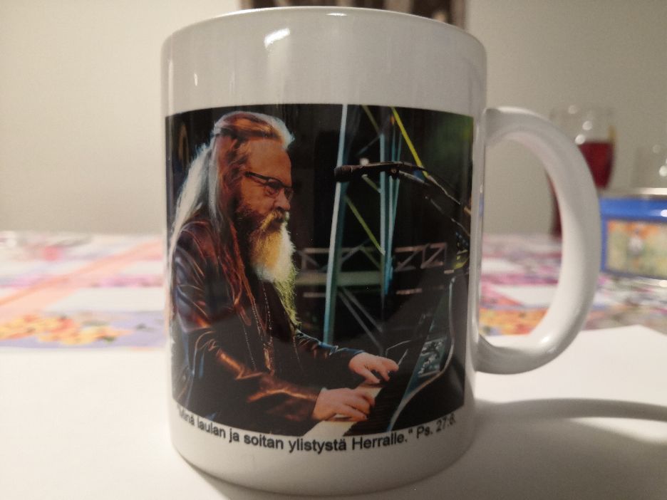 Sain tänään postista oman kappaleeni uusinta eli seitsemättä mukiani, jossa olen rockmuusikon näköinen. Alla on teksti: ”Minä laulan ja soitan ylistystä Herralle.” Ps. 27:6.